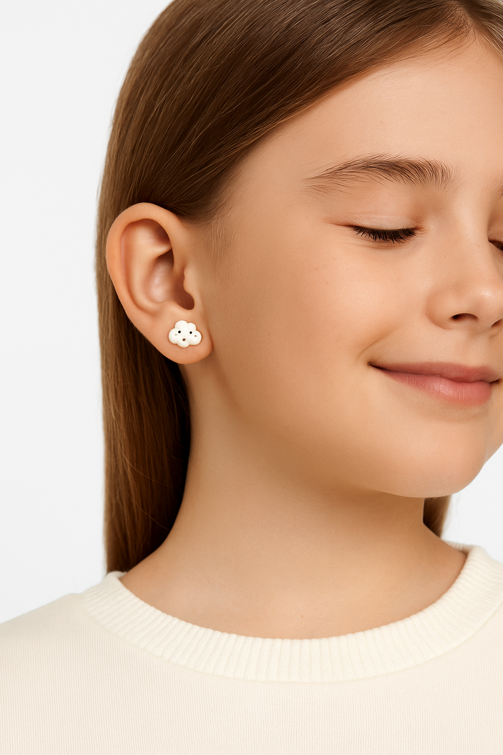 Внесете много нежност и добро настроение с нашите уникални детски сребърни обеци "Усмихнат Облак". Този закачлив и сладък дизайн е изпълнен с полупрозрачен бял емайл, който имитира пухкаво облаче, а малките усмивки придават чар и игривост.