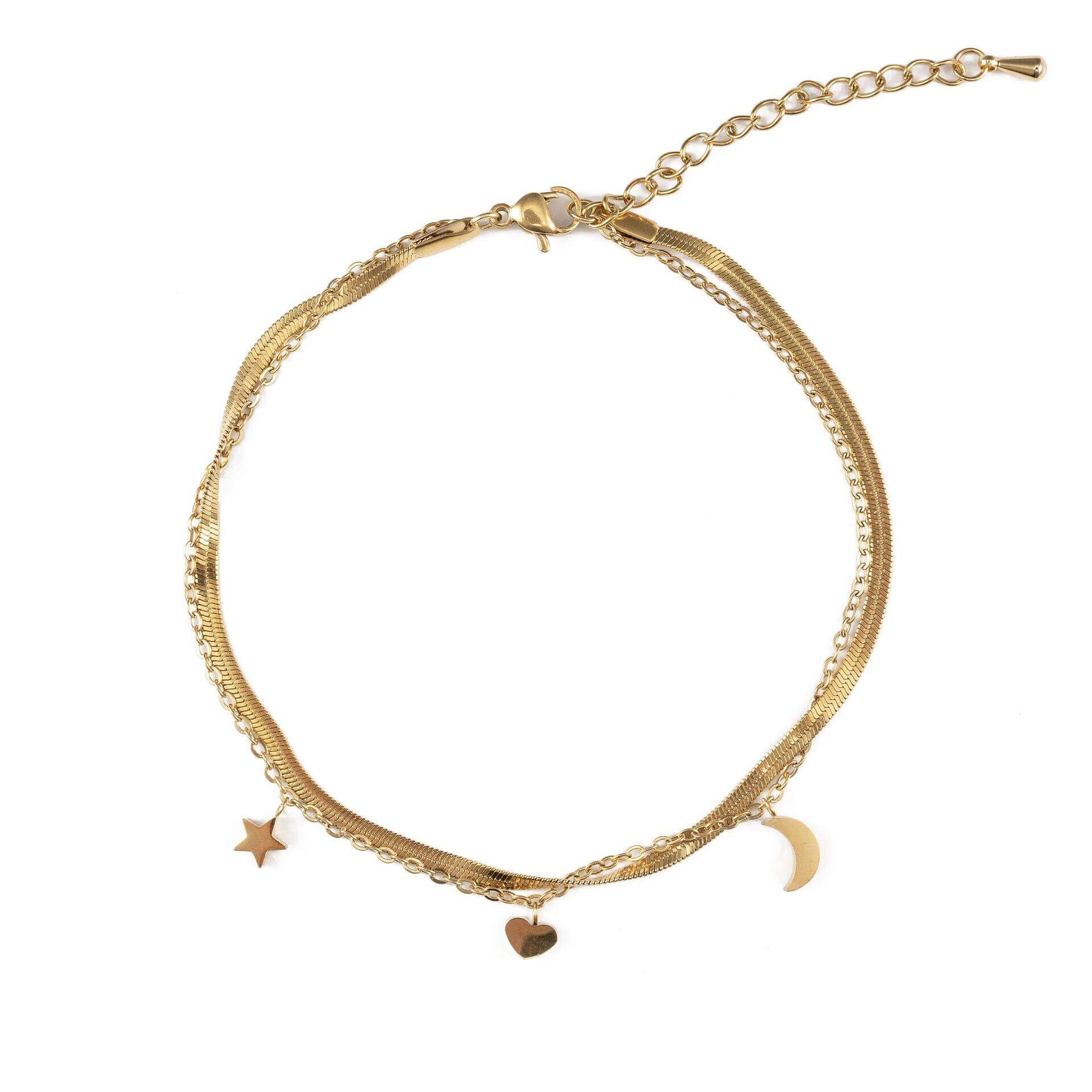 Двойна гривна за глезен с висящи символи луна, сърце и звезда, златисто покритие, подходяща за ежедневна употреба.