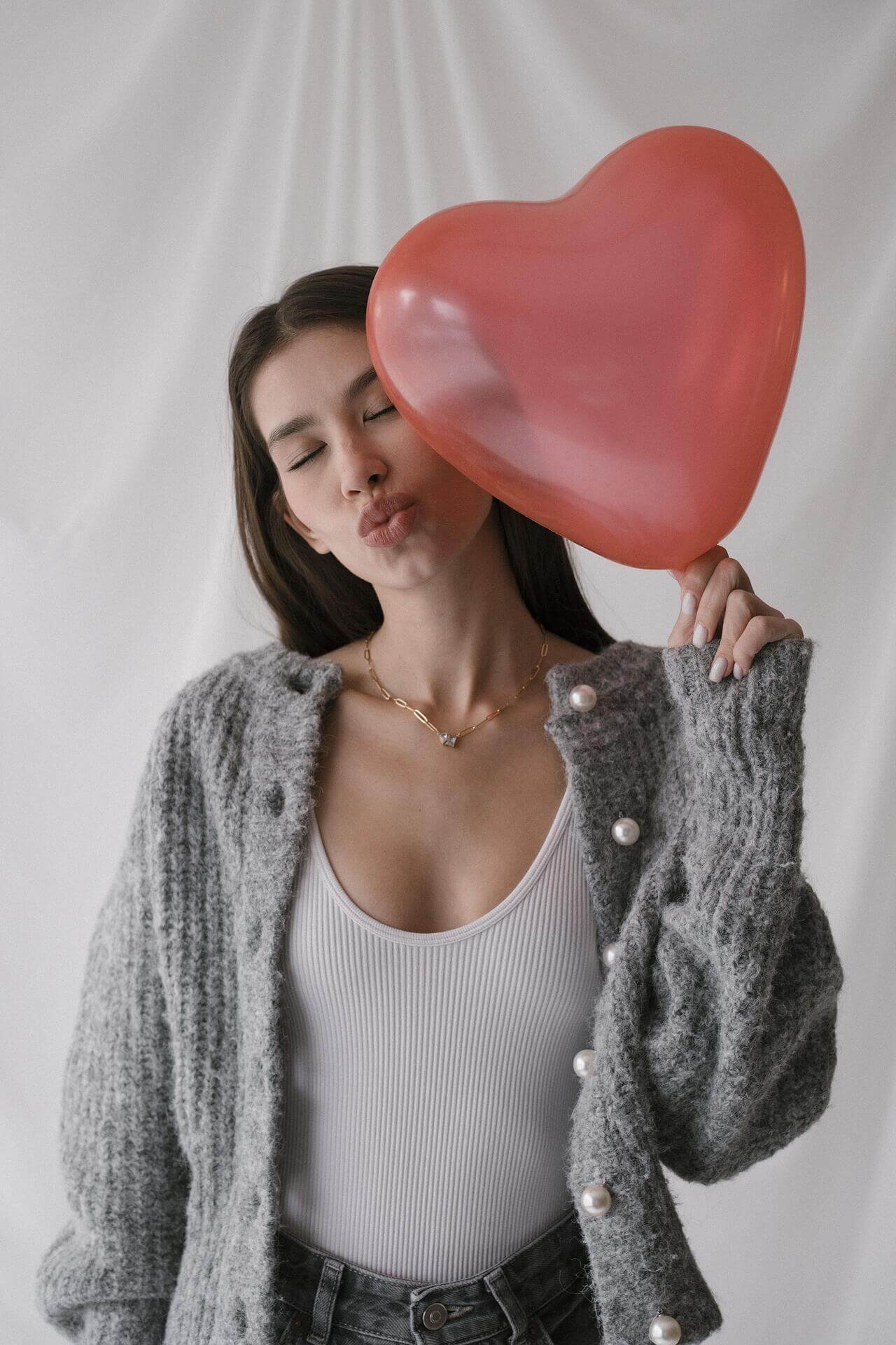 Млада жена в серо-сив пуловер с перли, държи червена сърцеформа балон.