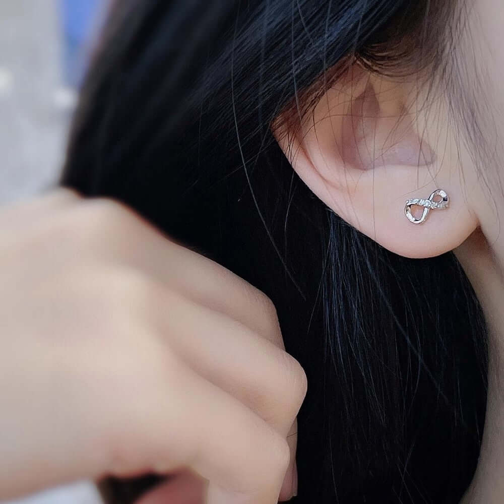 Сребърни обеци Безкрайност S925, стилен дизайн с безкрайна форма, носени от жена.