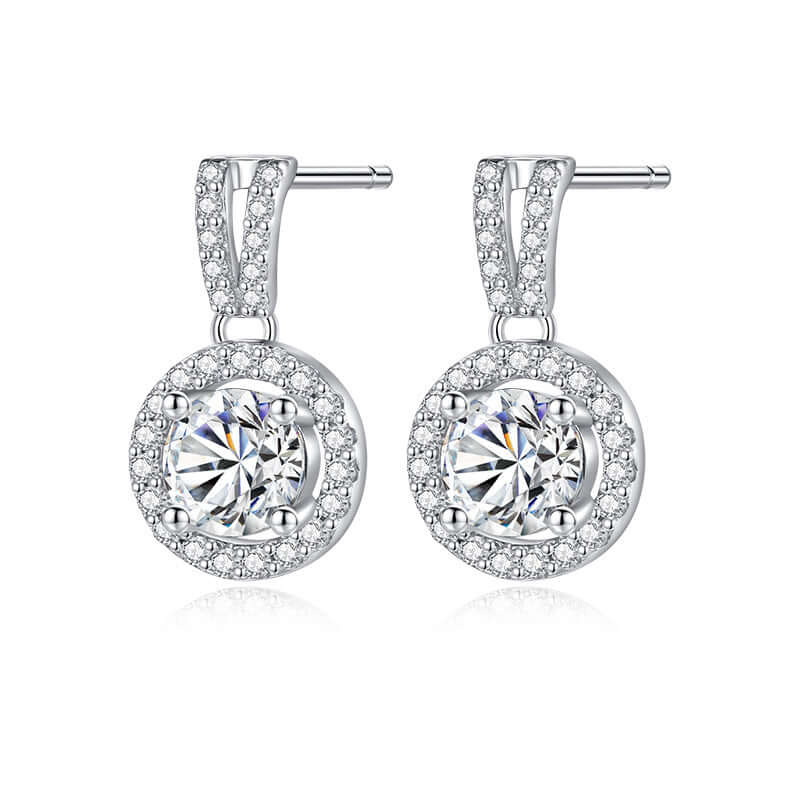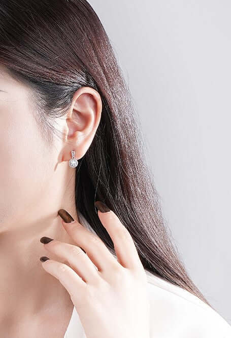 Сребърни обеци Разкош S925 с кристали, носени от жена, с дълга тъмна коса.