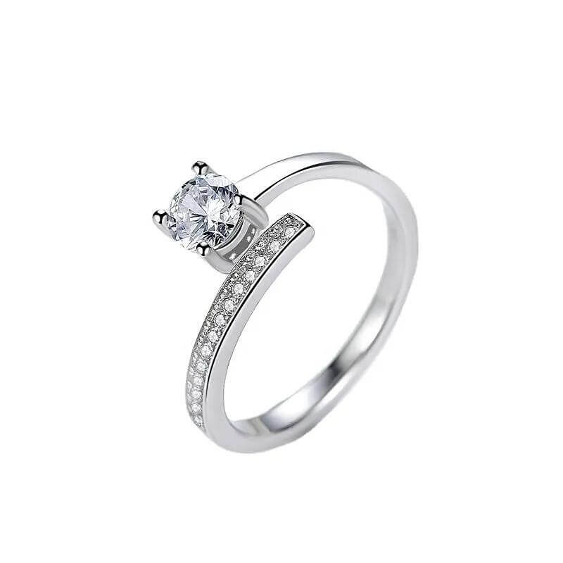 Woman wearing a shiny S925 silver ring with crystal and zirconia, posing in a stylish outfit.