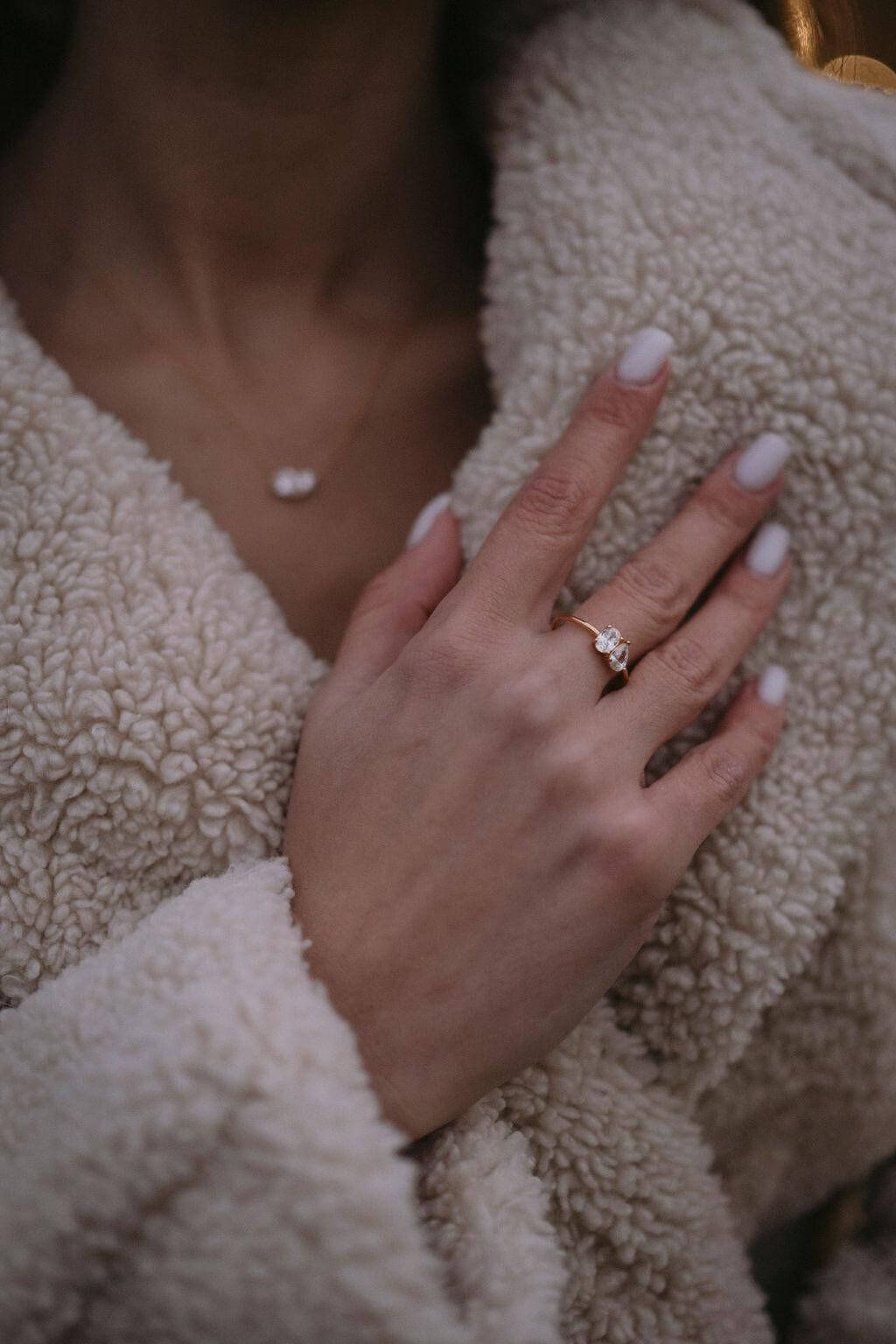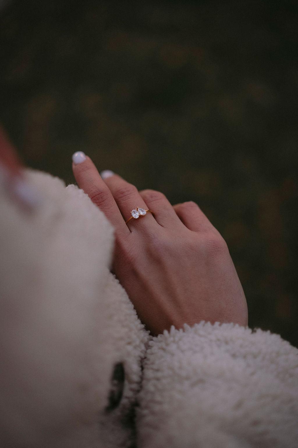 Сребърен пръстен Passion с цирконий, носен на ръка с бял маникюр и топъл плетен пуловер.