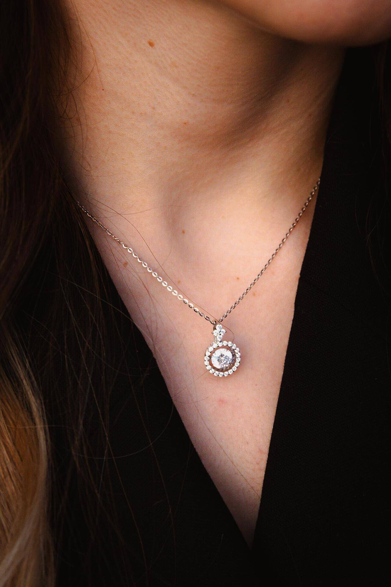 Елегантно сребърно колие с блестящ камък, носено от жена, подходящо за специални поводи.