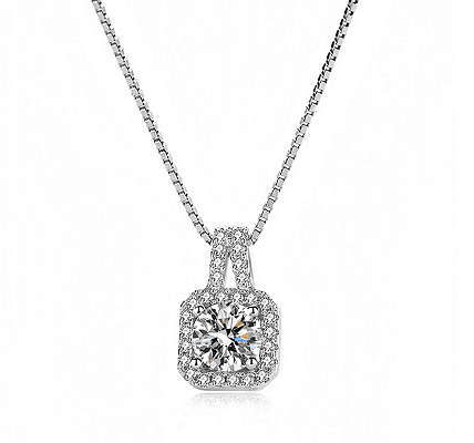 Елегантно сребърно колие с блестящ камък, носено от жена с минималистичен стил и облекло.