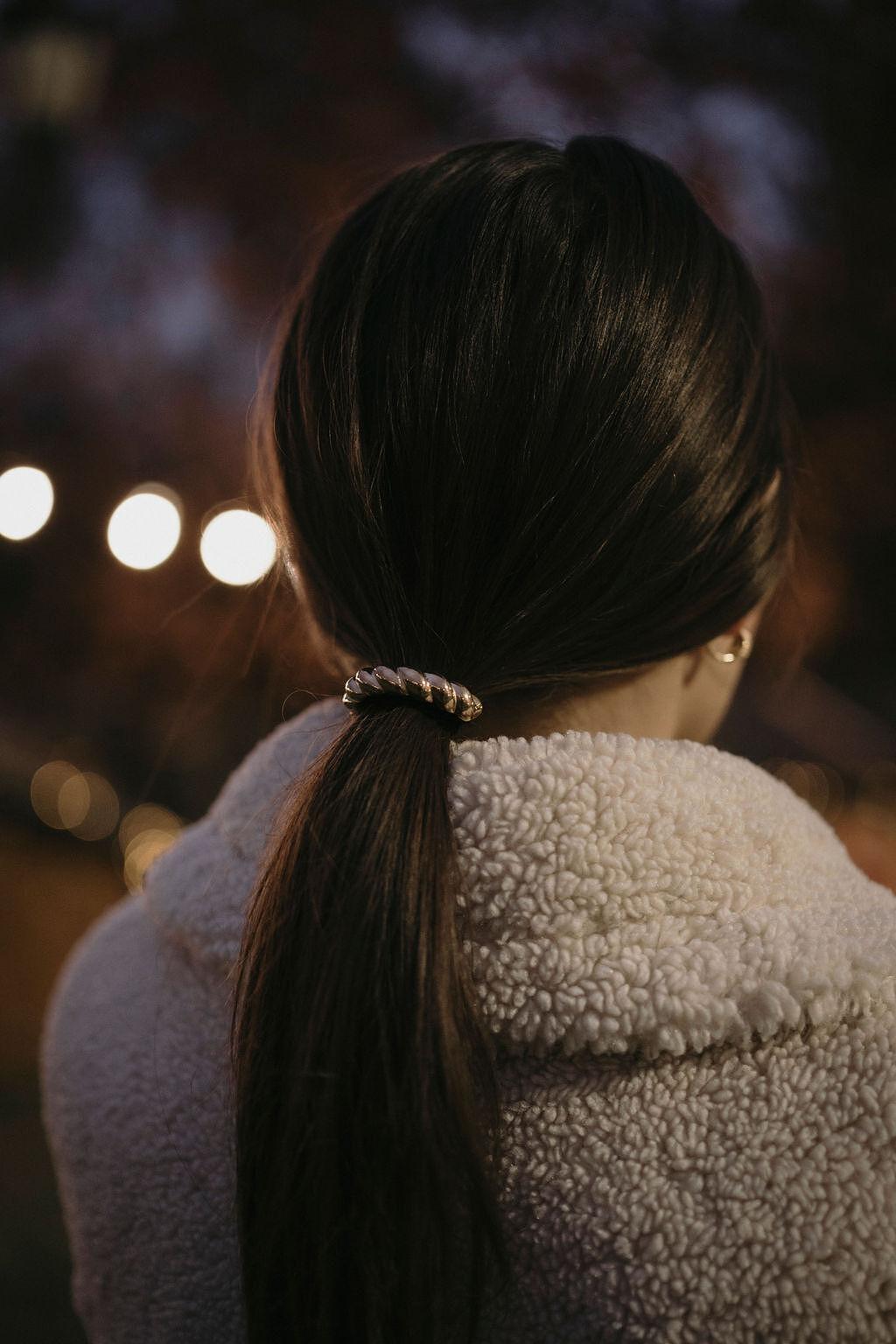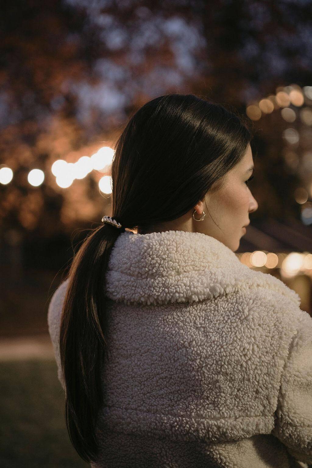 Жена с дълга коса, вързана в опашка, облечена в уютно палто на фона на вечерни светлини.