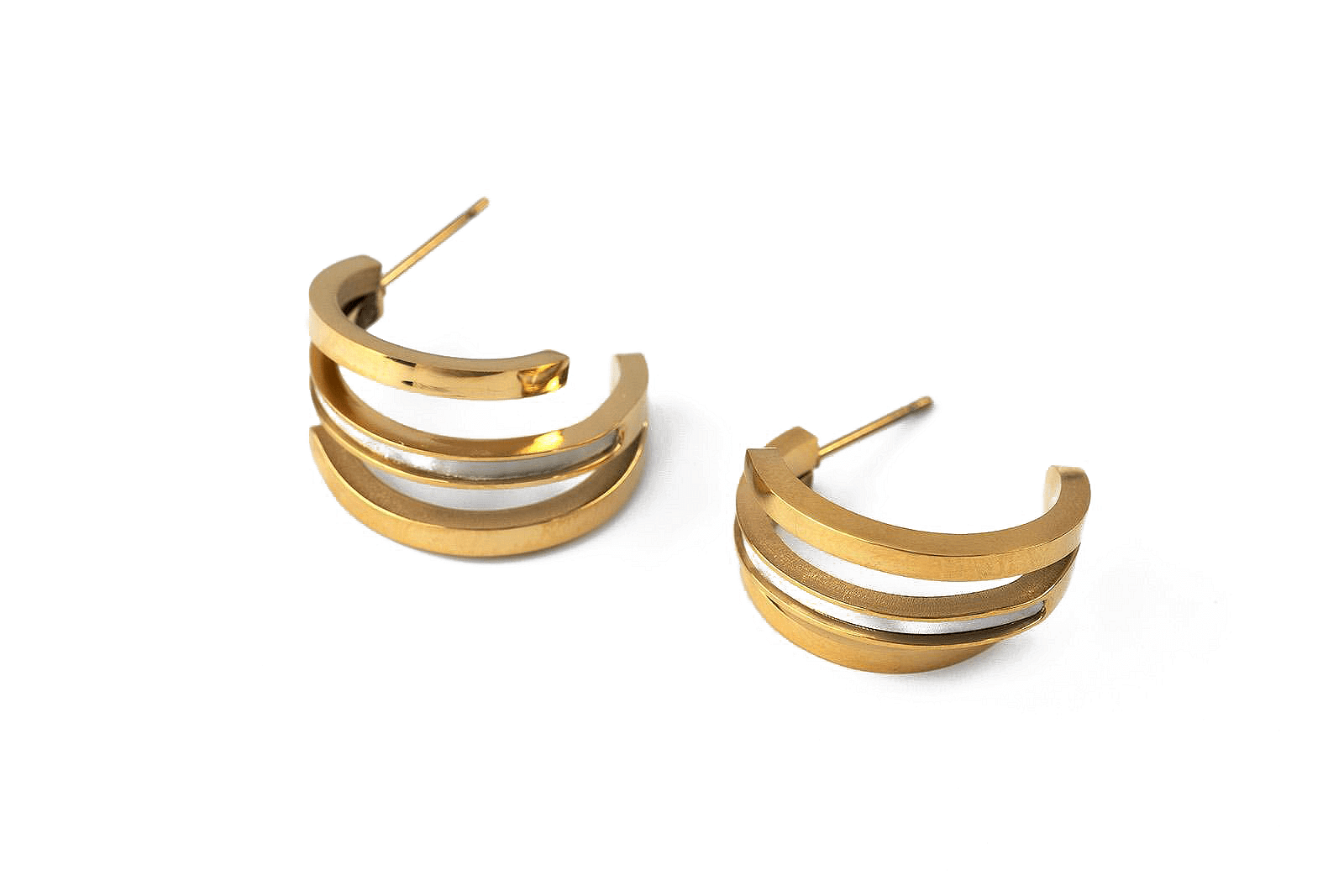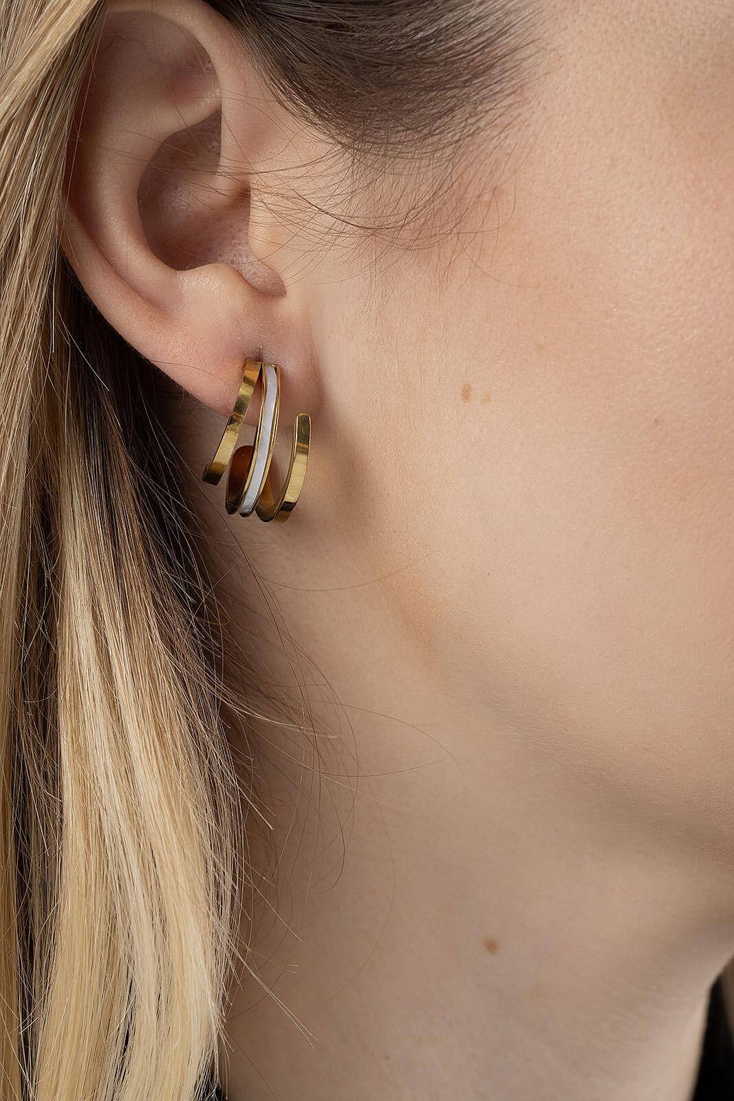 Златисти тройни обеци със седеф, изработени от медицинска стомана, акцент на стил и изящество.