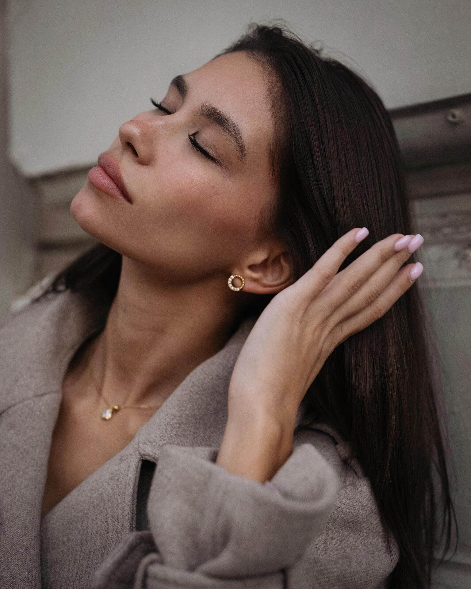 Модерна жена с дълга коса, носеща златисти обеци "Хибрид" с 18K златно покритие.