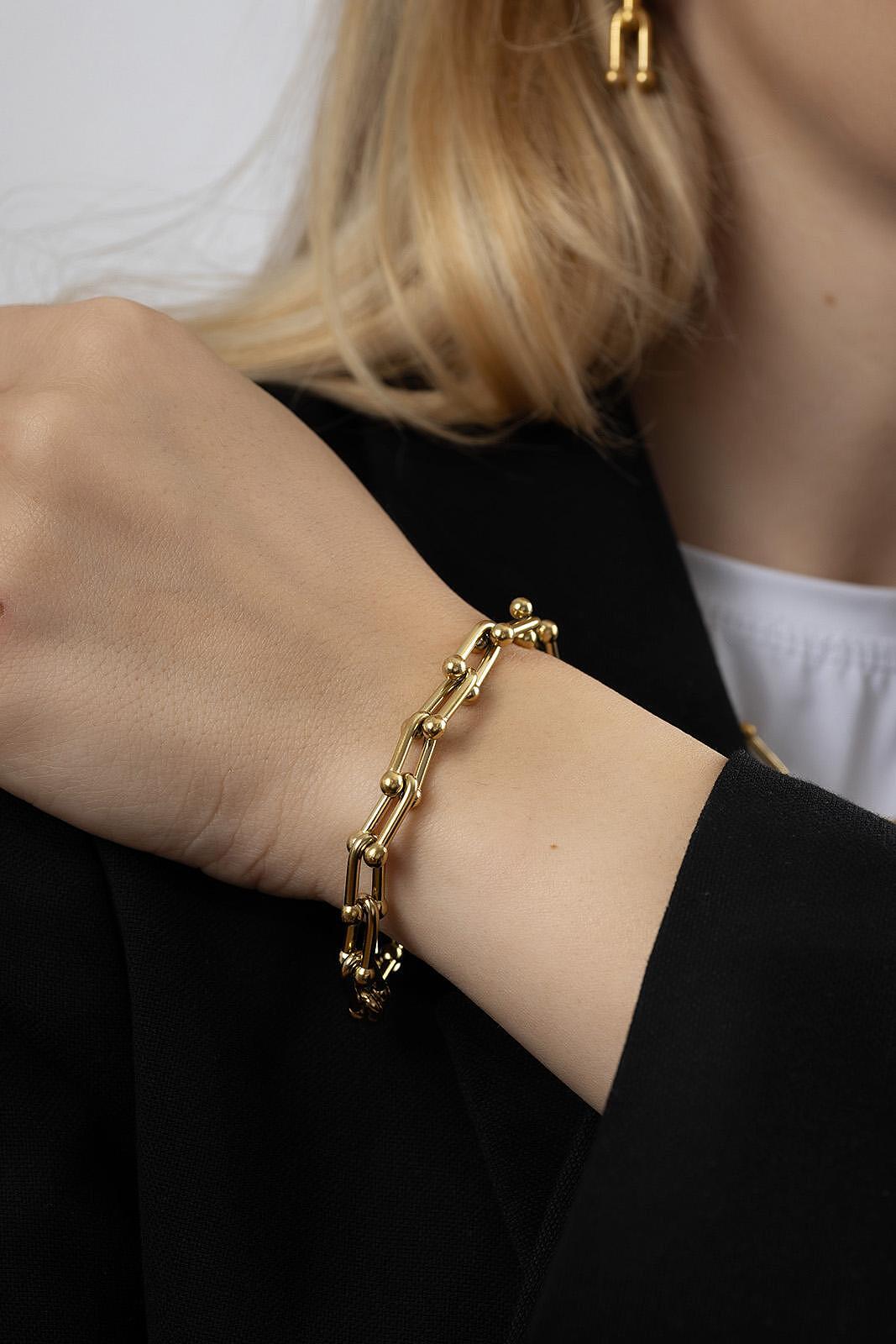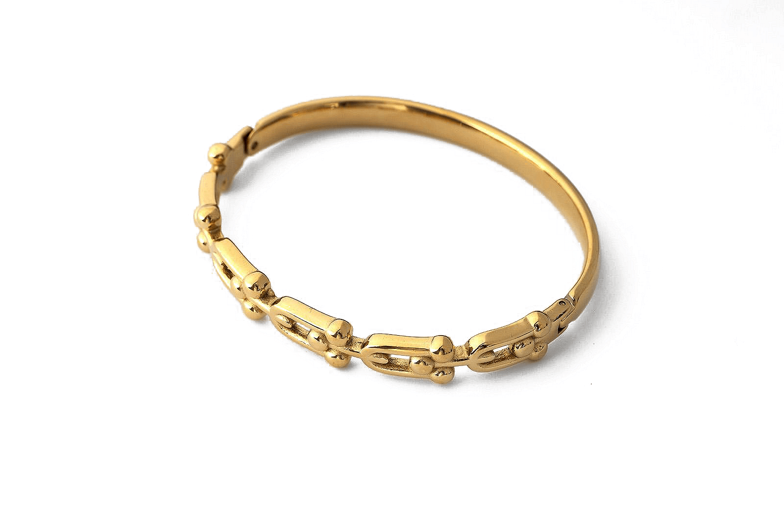 • "Σχεδιαστικό, σκληρό βραχιόλι σε χρυσή απόχρωση από υψηλής ποιότητας χειρουργικό ατσάλι — συνδυάζει κομψότητα και μινιμαλιστικό σικ. Το χειρουργικό ατσάλι προτιμάται στα κοσμήματα για την αντοχή του, την αντίσταση στη διάβρωση και το γεγονός ότι δεν μαυρίζει. Είναι υποαλλεργικό και ασφαλές για ευαίσθητο δέρμα, προσφέροντας άνεση στην καθημερινή χρήση. Το βραχιόλι διατηρεί τη λάμψη και την ομορφιά του με ελάχιστη φροντίδα — ιδανικό για γυναίκες που αναζητούν ανθεκτικά και κομψά κοσμήματα.