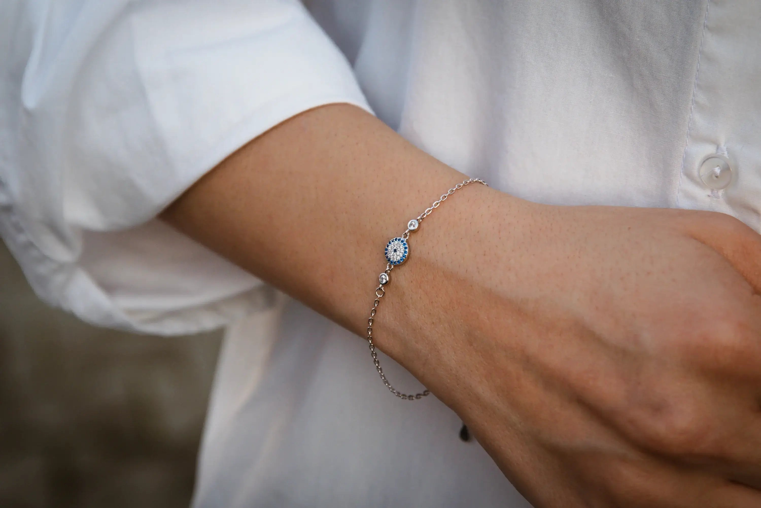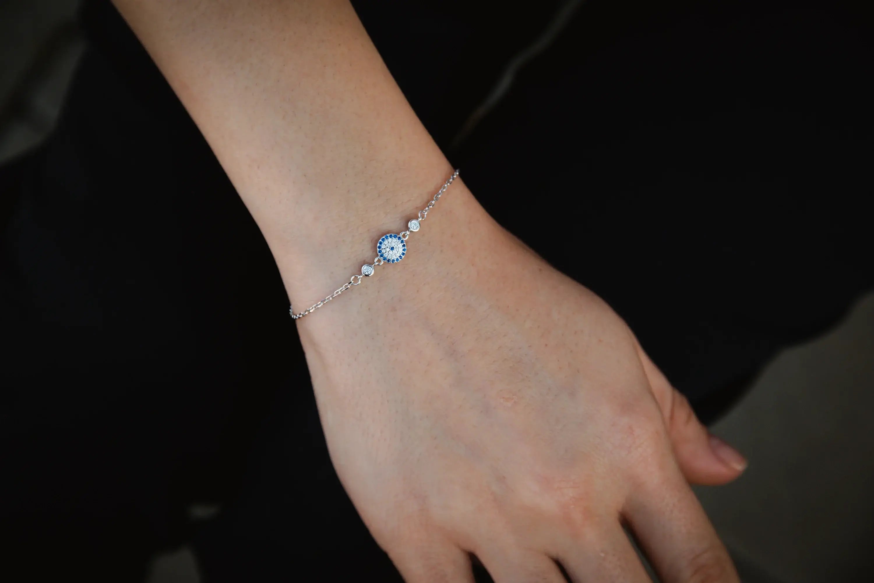 Сребърна гривна Hamsa със сини кристали, изработена от S925 сребро, подарък за стилен аксесоар.