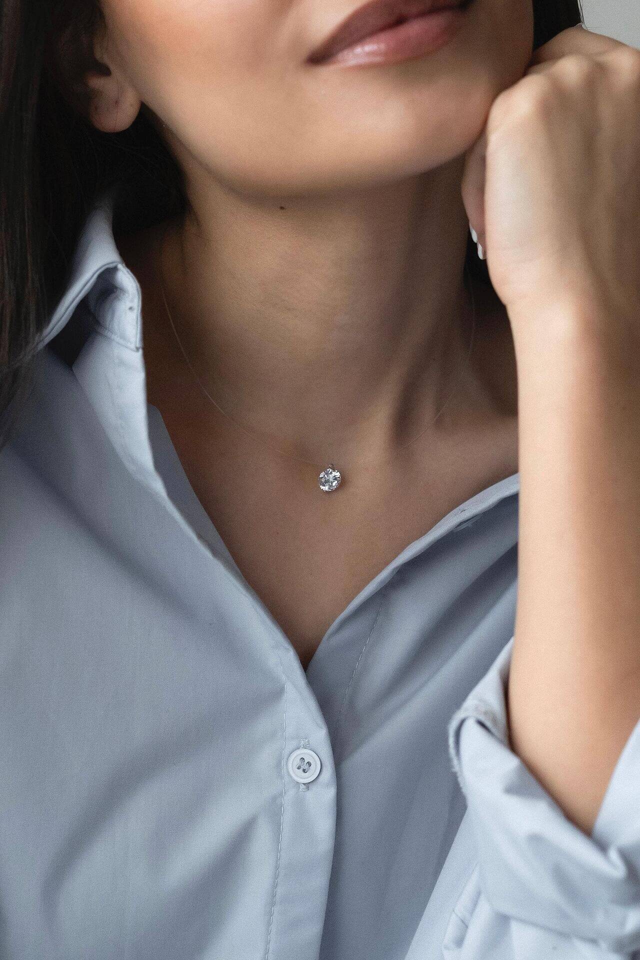 Сребърно колие с циркон на фона на жена в светло синя риза, акцентиращо на елегантност и стил.
