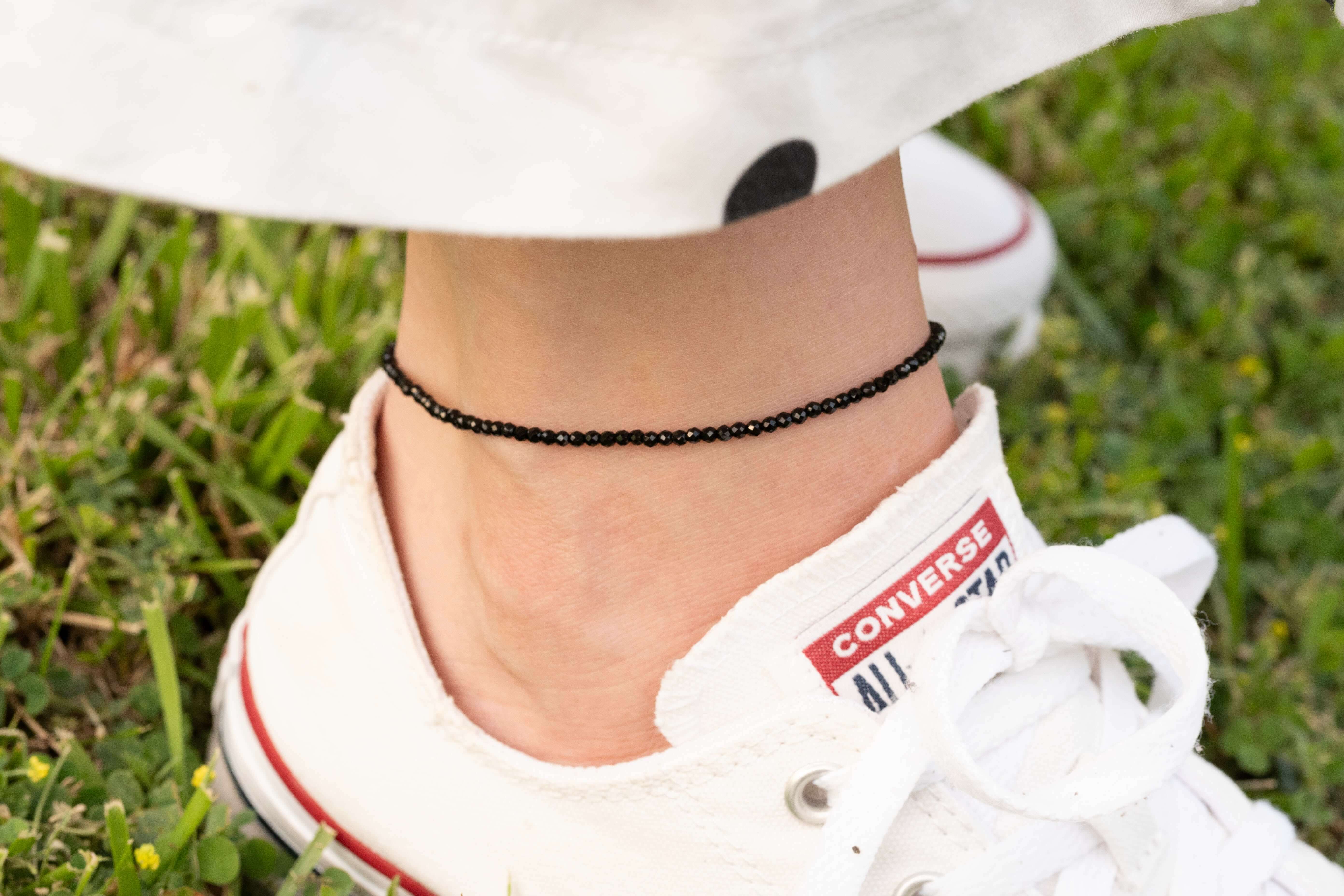 Гривна за глезен с черни мъниста, стилна и универсална, идеална за летни визии.
