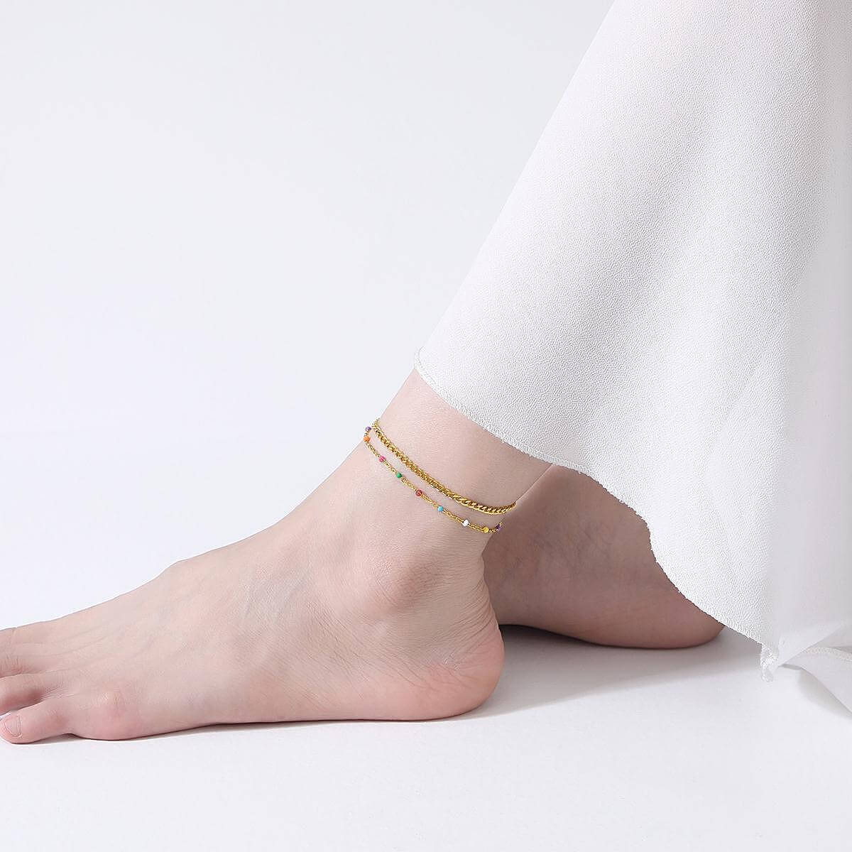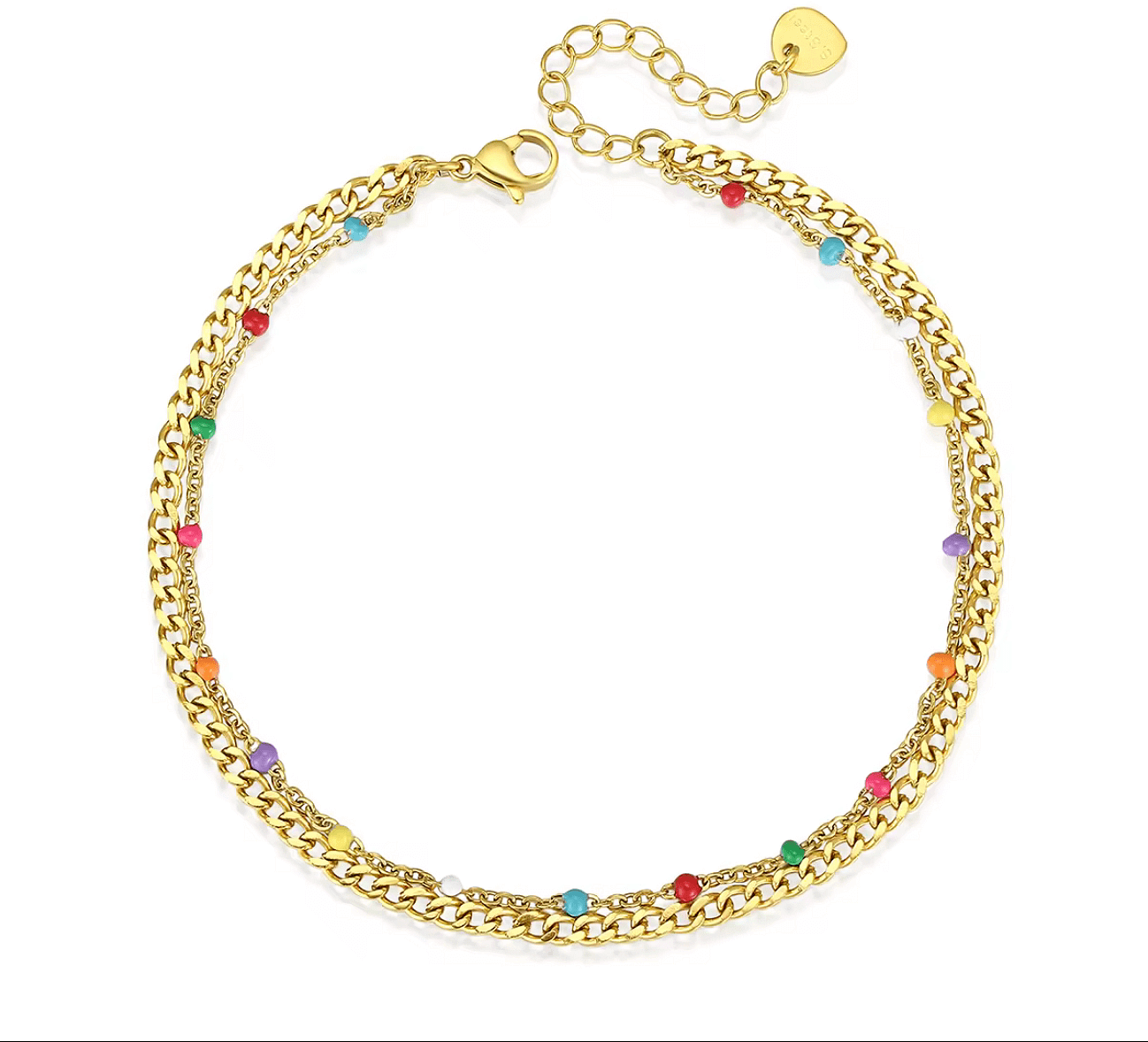 Двойна гривна за глезен с цветни камъчета и златисто покритие, идеална за летни дни.