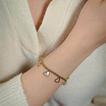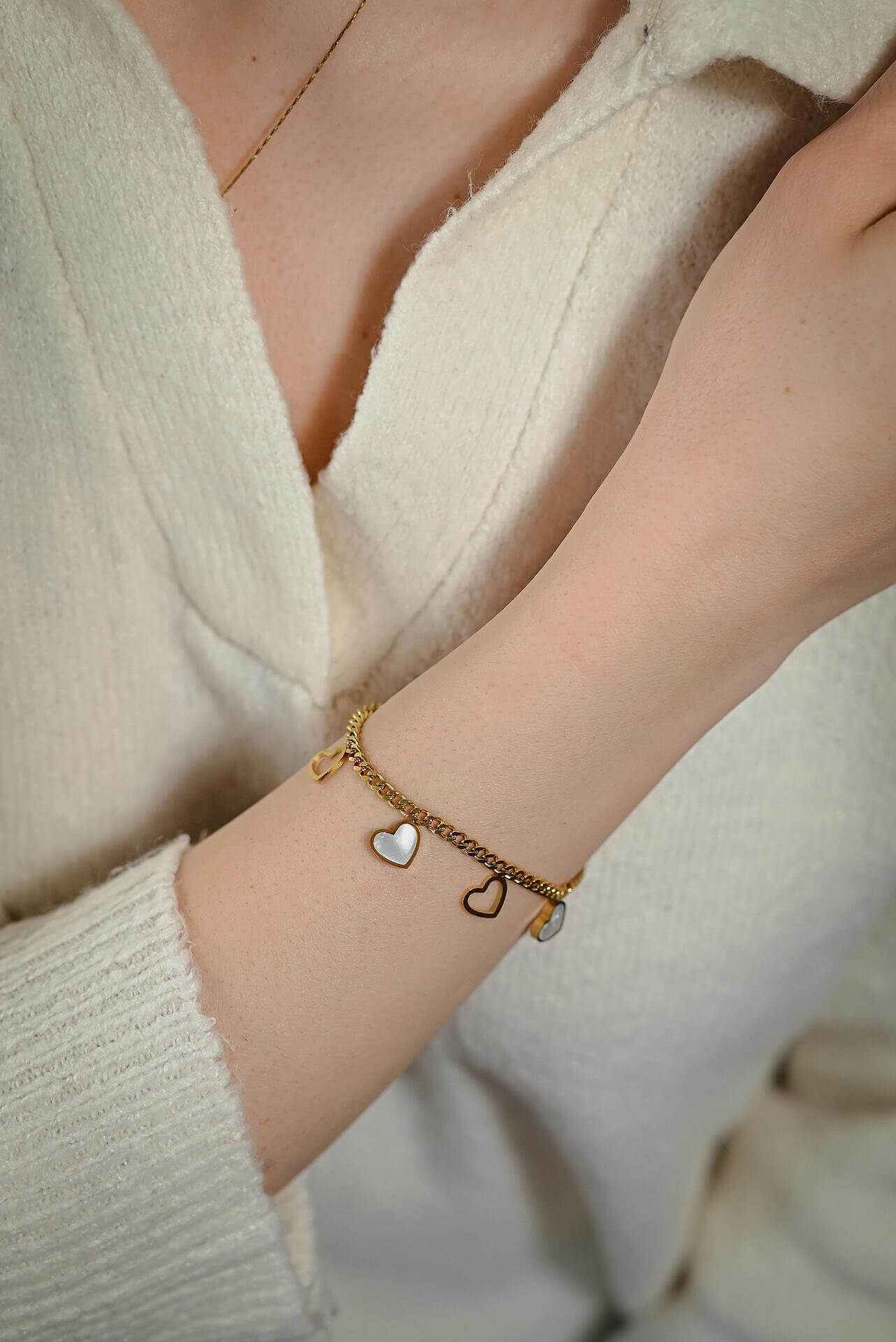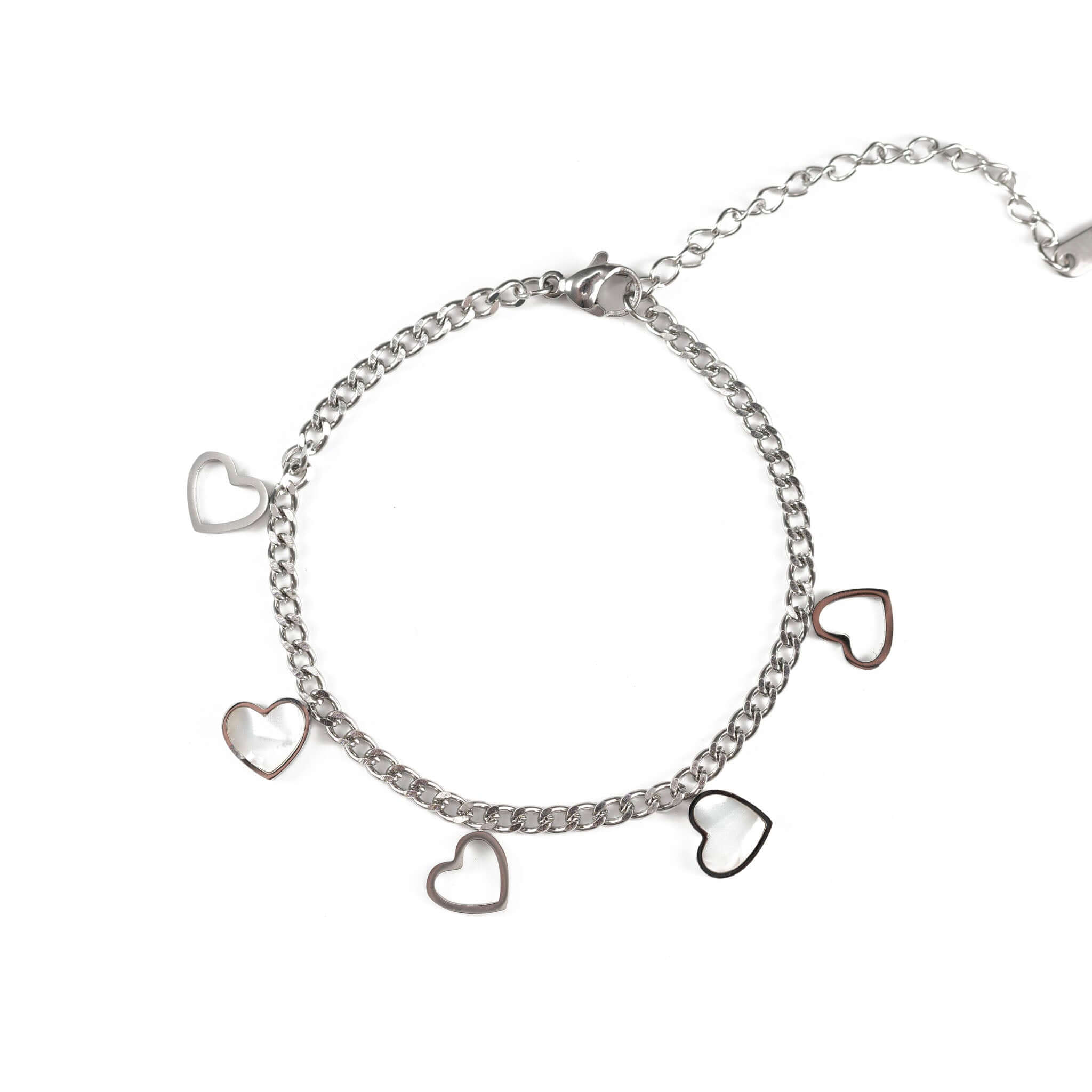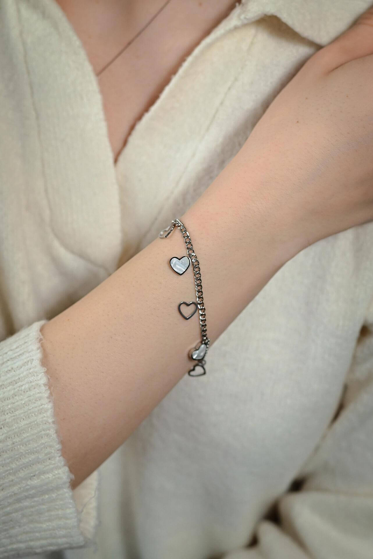 • Απαλό βραχιόλι με φίλντισι και καρδιές από ατσάλι — διακριτικό και κομψό για κάθε περίσταση. Κατασκευασμένο από υποαλλεργικό χειρουργικό ατσάλι 316L, με άνετη εφαρμογή και ρυθμιζόμενο μήκος. Τα λευκά στοιχεία από φίλντισι χαρίζουν περλέ λάμψη.