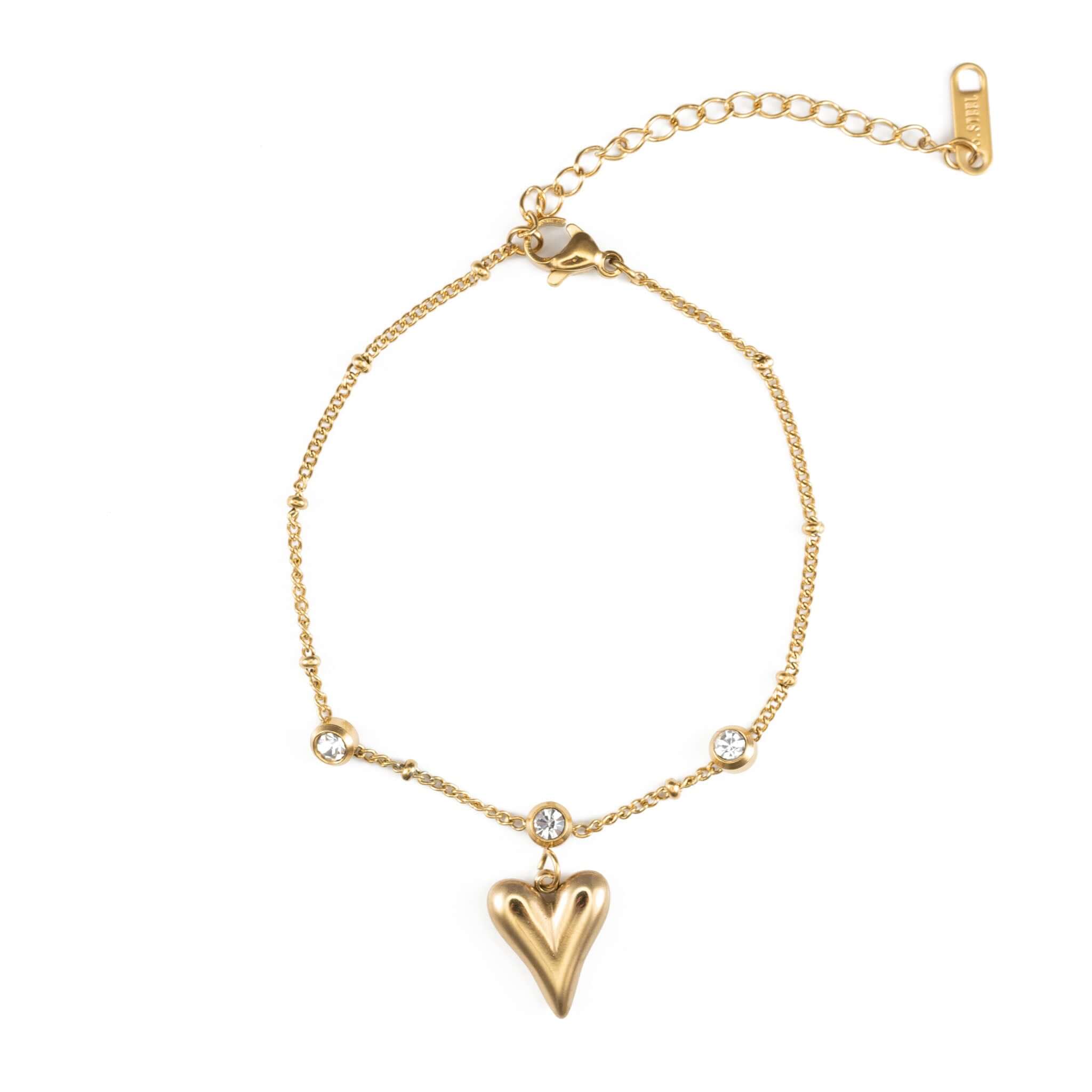 Мека зластиста гривна със сърце и кристали, идеален аксесоар за елегантна визия.
