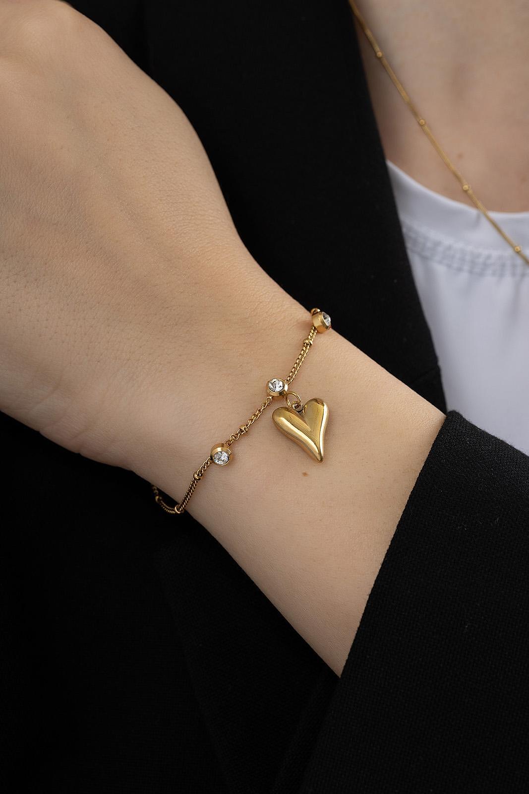 Елегантна златиста гривна с висулка във формата на сърце и бляскави камъни, перфектен романтичен аксесоар.