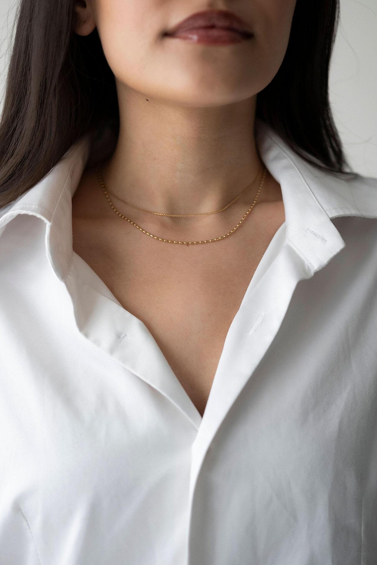 Златисто двойно колие Elara на нежна жена, облечена в бяла риза, изтъкваща елегантния дизайн.
