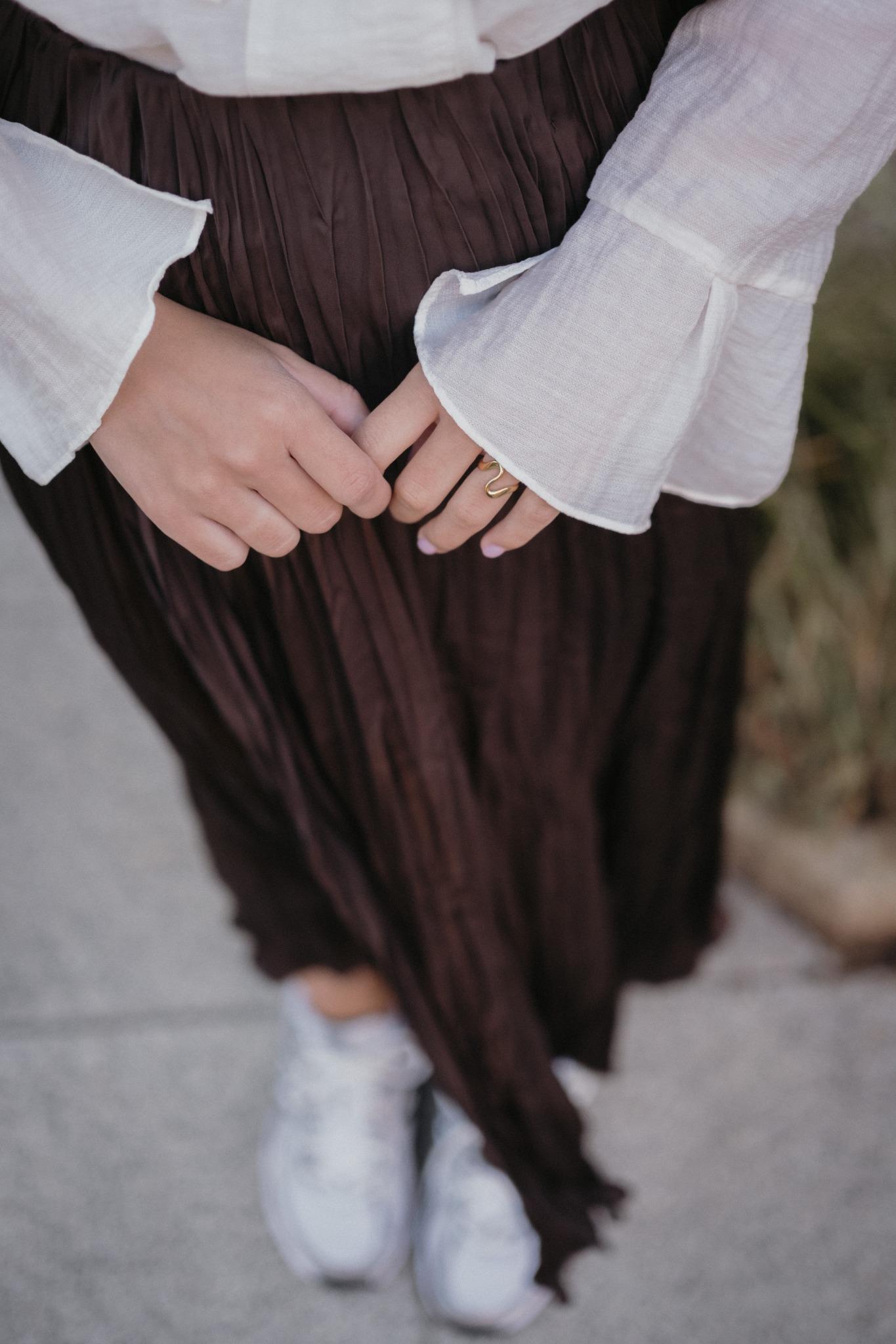 стилна жена с златист пръстен Wave и кремава риза, носеща къса пола на улицата