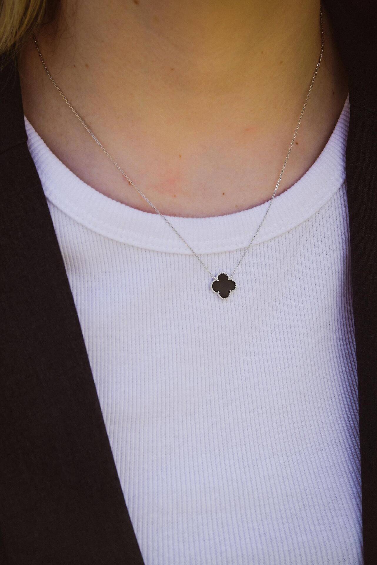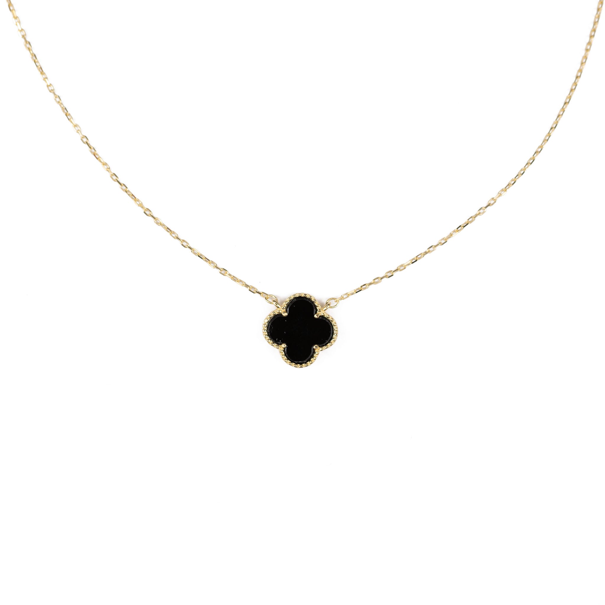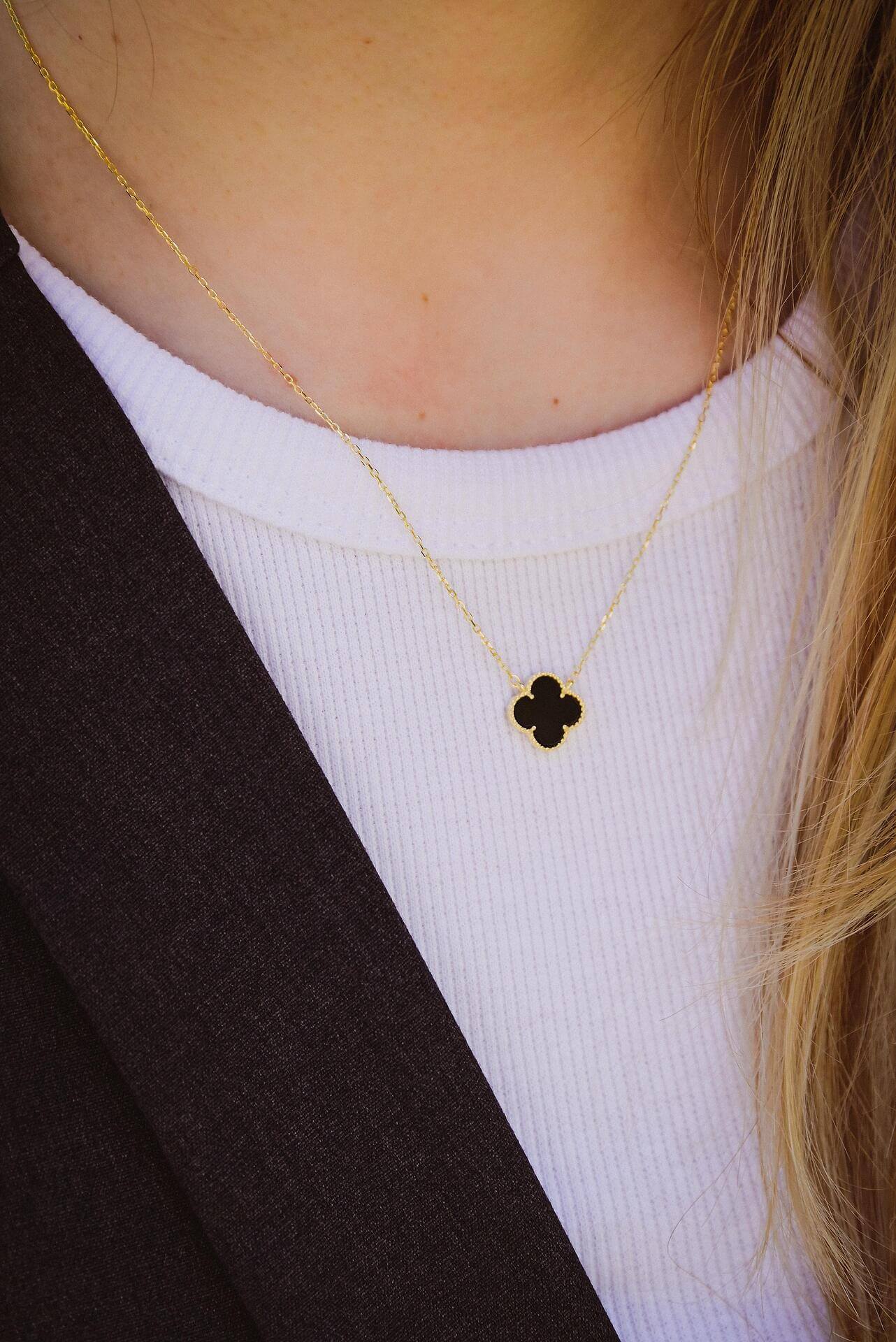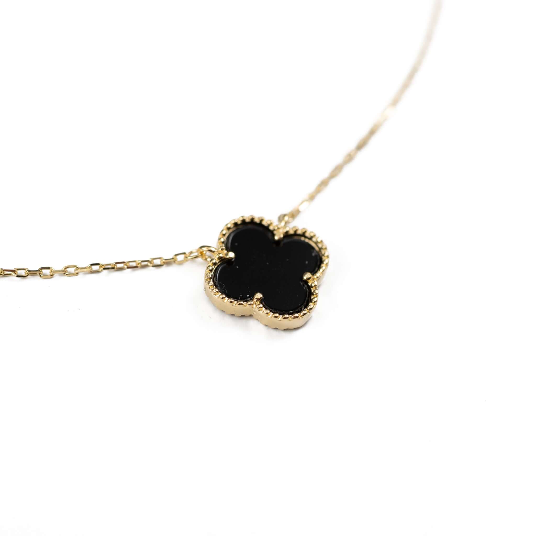 • Μενταγιόν: Τριφύλλι από επιχρυσωμένο ιατρικό ανοξείδωτο χάλυβα, διακοσμημένο με μαύρο φίλντισι.